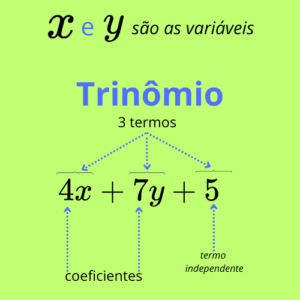 - Trinômio: É uma expressão que possui três termos. Exemplos: x² + 5x + 6, a + b – c.
